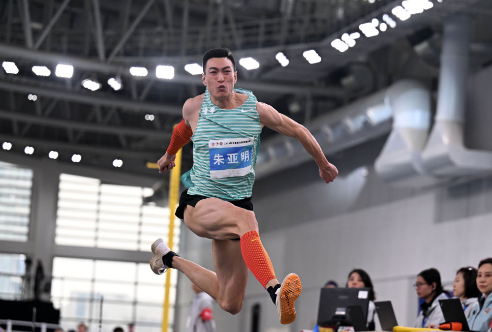 资料图:3月17日,朱亚明在全国室内田径锦标赛男子三级跳远比赛中。新华社记者赵子硕摄